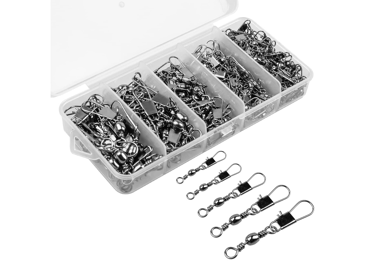 A box of five assorted medium to large size fishing swivels made of stainless steel feature excellent build quality that will last a lifetime.